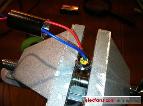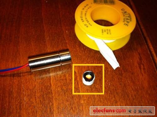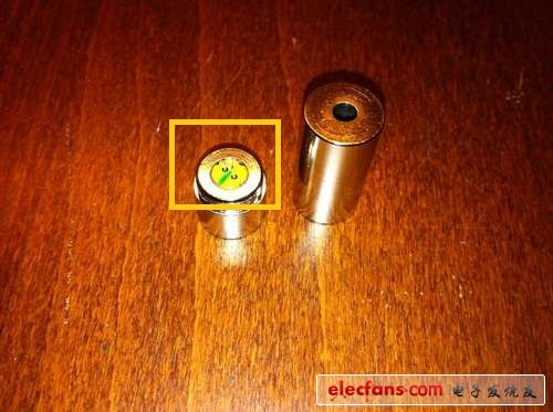 在激光發(fā)射器外殼背部的小孔正好可以讓二極管的引腳穿過