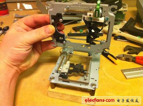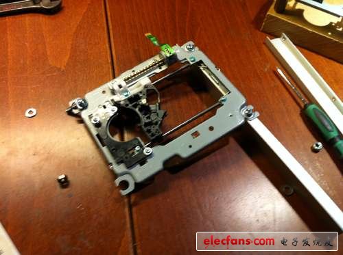 ● 既然我們已經把步進電動機組件拿了出來,那么我們就該做一下清理工作。把主軸電動機拆除,它可能有點用處,但是我覺得驅動它來太麻煩,于是我就把它們拋棄了。它們通常是用三顆非常小的螺絲固定起來的,不過有時它們會是一個更大的組件的一部分,因此在拆除時候要小心,不要弄壞了支撐鏡頭的兩根桿。