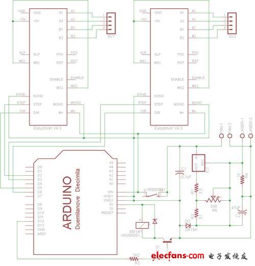 ● 整個電路構成了一種新式的 Arduino 電路——激光發(fā)射器控制電路。我已經附上了?Eagle格式?的電路圖和電路板布置圖。如果你想要自己布置 Easydrivers 的電路的話,我也準備了帶有驅動程序的 Eagle 庫文件,你可以在?這里?下載。