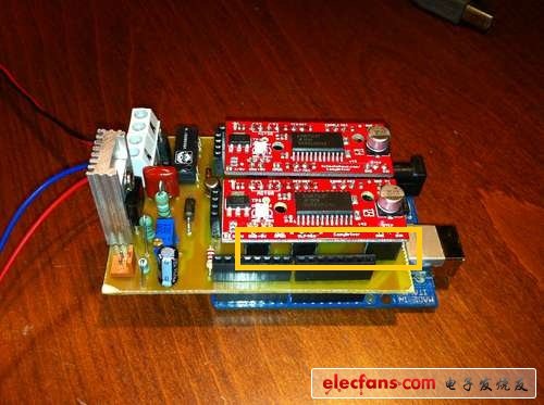 ● Easydriver 有兩個引腳,叫做 MS1 和 MS2,它們用于設定步進的序列。將它們雙雙連在 Easydriver 的5伏電壓輸出上。這樣就把步進序列設為了微步進控制。把從步進電動機伸出的四根引腳連接在電動機的輸出端,而控制引腳(step、dir 和 gnd)連在 Arduino 上。除了這些以外,Easydriver 還需要連上電動機電源。我用一個12伏的電源適配器驅動電動機、風扇和 Arduino。一個電位器被用于控制電動機的電源,把它設到最低就行,要是步進電動機的動力不足的話,就稍微調大一些。我并不清楚步進電動機的額定電壓,如果它們發(fā)燙了就說明你給的電壓太高。