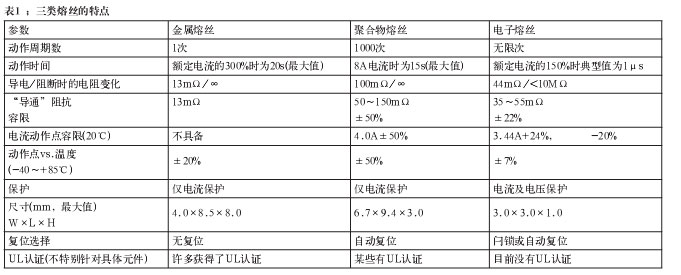 為了更好地了解市場上不同的熔絲選擇,我們比較了這問題常見的三種解決方案。金屬熔絲應(yīng)用已久,易于理解。它們通常聯(lián)合硅瞬態(tài)電壓抑制器(TVS)一起使用,結(jié)合了鉗位電壓尖峰和限流保護。聚合物器件以導(dǎo)電型塑料制成,這些器件在電流(內(nèi)部熱量)達到預(yù)設(shè)定的電平時會改變它們的阻抗。這些器件也經(jīng)常與TVS器件一起使用,就像金屬熔絲那樣。電子熔絲是半導(dǎo)體電路,控制功率開關(guān)(通常是功率MOSFET),并按照預(yù)設(shè)的參數(shù)改變其阻抗。表1簡單比較了這三類熔絲。