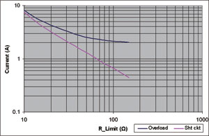 圖2展示NIS5132的一對曲線。導(dǎo)通較低的曲線時,激活的是短路曲線。一旦電流降低至低于這個電平,F(xiàn)ET就完全導(dǎo)通(線性區(qū)域),接下來面對的就是過載電平。如果電流達到過載電平,F(xiàn)ET的柵驅(qū)動將立即減小,而漏極至源極電壓將增加,并會將工作模式改為短路電平模式。這器件在過載電平時不能維持穩(wěn)態(tài)工作。