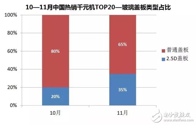 11月中國熱銷千元機TOP20中,采用2.5D玻璃蓋板的機型的有7款,占比35%。