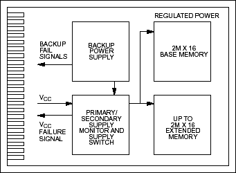 512K X 16 80-Pin JEDEC Standard SIP StikWith items 1, 2, and 3 of the system requirements met, the next functions that can be easily consolidated into a one-chip solution are the power switching functions. The DS1336 is ideally suited for our system requirements (see Figure 2). The device can switch between a 3V or 5V, 1.5A supply to a backup 3V supply, with a maximum backup current of 4 mA. The DS1336 requires an external notification of a power failure. Once the external input is activated, the DS1336 immediately switches from the primary power supply to the backup power supply, in this case a lithium power source. Since the DS1336 has two complemented power-fail inputs, Active-low PF and PF , one can be used for the on-card power monitor, and the other can be connected to a power-fail status indicator on the backplane which can provide an advanced warning of a power failure, before it reaches the memory card.