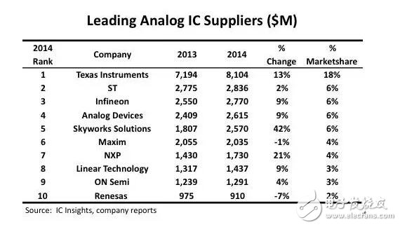 根據(jù)IC Insights的分析報告,2014德州儀器(TI)衛(wèi)冕模擬器件老大地位,其2014年模擬IC銷售額為81億美元,占據(jù)全球模擬IC市場18%的份額。前十大模擬IC廠商份額占全球份額的57%,比2013年56%微升一個百分點。前十大中,有6家銷售額超過20億美元,另外三家超過10億美元,只有瑞薩年銷售額不足10億美元(這已經(jīng)是瑞薩模擬IC銷售額連續(xù)兩年低于十億美元)。Skyworks Solutions(42%)、恩智浦(21%)和德州儀器(13%)是前十大模擬廠商中增長最強勁的,遠超模擬IC市場平均9%的增長率。