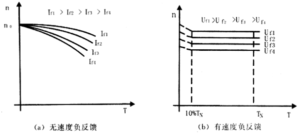?。?)當(dāng)勵(lì)磁電流一定時(shí),從動(dòng)部分轉(zhuǎn)速將隨著負(fù)載轉(zhuǎn)矩增加而急劇降低,并且這種下降在弱勵(lì)磁電流的情況下更加嚴(yán)重,如圖2-20a所示,它具有較軟的機(jī)械特性,這種軟的機(jī)械特性在許多情況下,不能滿足生產(chǎn)機(jī)械的要求。為了獲得范圍較廣,平滑而穩(wěn)定的的調(diào)速特性,通常采用速度負(fù)反饋的措施,使電磁滑差離合器具有如圖2-20b所示的硬機(jī)械特性。
