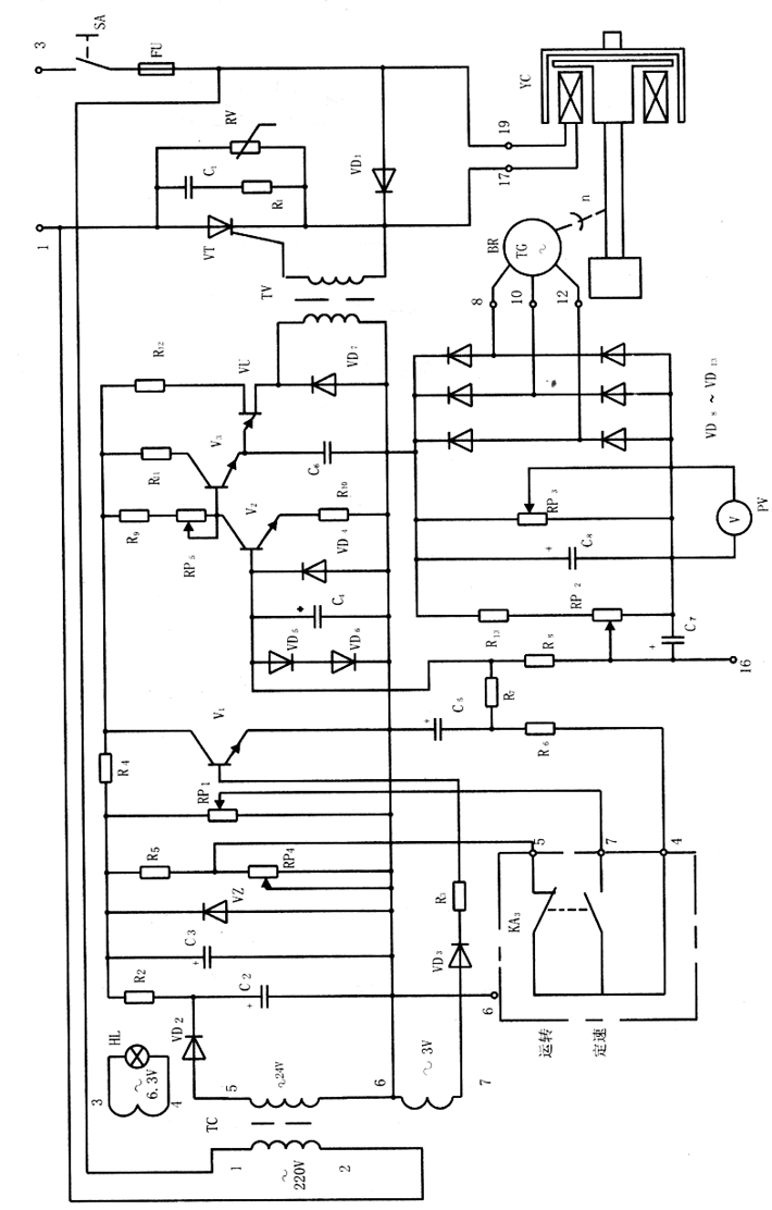 ?、俳o定電壓環(huán)節(jié)。給定電壓環(huán)節(jié)起始于變壓器TC副邊5端、6端間的繞組。24V的交流電壓經(jīng)VD2、整流并經(jīng)C2、R2、C3濾波和VZ穩(wěn)壓,得到16V的直流電壓。最后由R5和RP4“定速”檔的轉(zhuǎn)速?!斑\(yùn)轉(zhuǎn)”、“定速”由中間繼電器KA3控制。