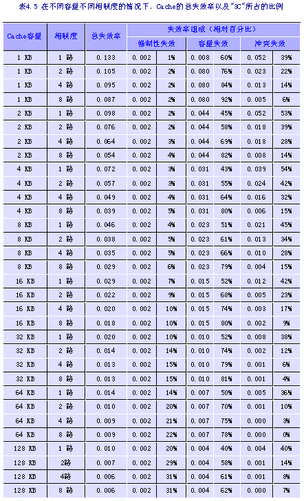 表4.5針對(duì) SPEC92 典型程序給出了上述三種失效所占的比例(這些數(shù)據(jù)是在 DECstation 5000上測(cè)得的。假設(shè) Cache 的塊大小為32字節(jié),并采用 LRU 算法)。為了說(shuō)明高相聯(lián)度的好處,表中列出了在直接映象、兩路組相聯(lián)、四路組相聯(lián)和八路組相聯(lián)的情況下,沖突失效的值??梢钥闯觯?