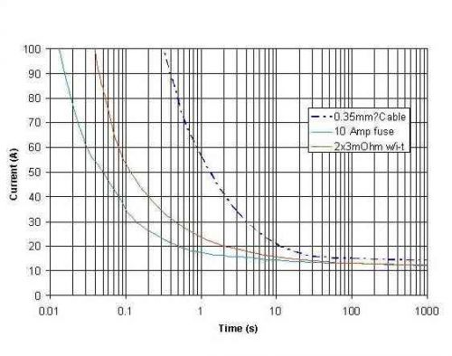 圖10:采用保護(hù)算法的外推i2-t曲線與電線和熔斷器比較