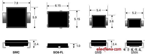 SO8FL小外形扁平引腳封裝面世的目的是使較大的半導(dǎo)體裸片可以適應(yīng)標(biāo)準(zhǔn)SOI IC占位面積。這種封裝使用引線框設(shè)計(jì),封裝中引線延伸至超出封模本體尺寸之外。這種特征表示可以完整看到填錫,因此使外觀檢查過程更為有效。此外,這種類型的封裝也提供更高的散熱等級(jí)及更低的電氣寄生效應(yīng)。它的厚度顯著低于DPAK、SMA、SMB、SMC、Powermite或SOD-123等封裝,如圖2所示。此外,這類封裝適合更寬范圍的裸片類型。