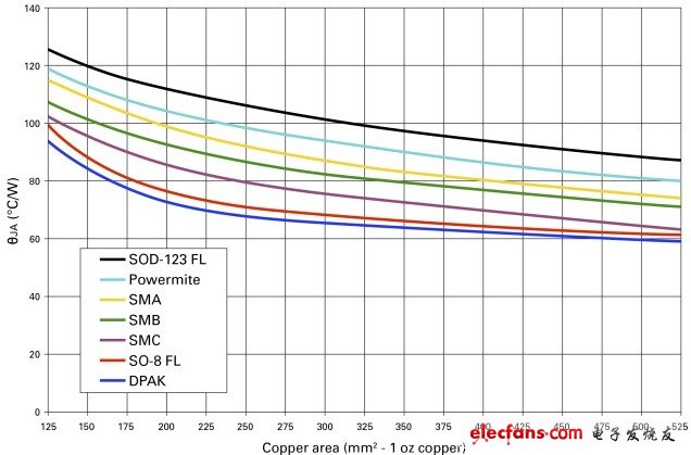 SO-8 FL封裝的熱阻抗明顯優(yōu)于SOD-123 FL、Powermite、SMA、SMB或SMC封裝類型(如圖4所示),這是因?yàn)樗芴峁└痰纳崧窂?,而且裸片接觸銅焊墊。