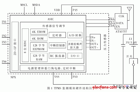 輪胎監(jiān)測(cè)模塊嵌入到輪胎里面,主要用來監(jiān)測(cè)輪胎內(nèi)部氣壓和溫度狀況,并通過無線調(diào)制方式發(fā)送到主機(jī)顯示模塊,故輪胎監(jiān)測(cè)模塊主要應(yīng)包含傳感器、微控制器、UHF發(fā)射器以及供電電池。整個(gè)模塊放置在輪胎里面,在汽車高速行駛時(shí)且輪胎內(nèi)部產(chǎn)生高溫情況下要能正常運(yùn)行,并且能保證有效工作5~10年,故而模塊的小型化、寬工作溫度范圍以及低功耗設(shè)計(jì)就顯得尤為重要。
