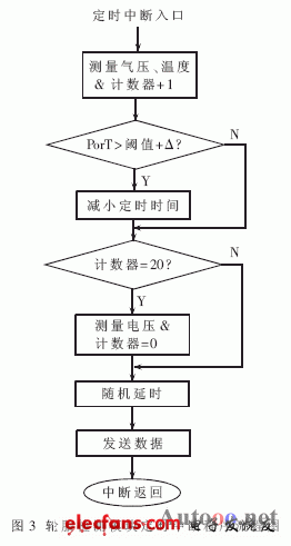 輪胎監(jiān)測模塊的主程序在執(zhí)行完初始化功能后便根據(jù)當(dāng)前氣壓值與報警閾值的差值設(shè)置定時中斷時間,然后進(jìn)入低功耗模式。模塊供電電壓、輪胎氣壓和溫度的監(jiān)測與數(shù)據(jù)的傳輸都放置在中斷程序,中斷結(jié)束立即進(jìn)入低功耗模式。NPX-C10746內(nèi)置中斷定時時間大約為0.5秒~4秒,輪胎氣壓和溫度正常時,可取3秒定時中斷一次,調(diào)用NPX的輪胎氣壓和溫度檢測與補償、CRC-16校驗計算執(zhí)行庫后,通過無線方式發(fā)送給主機(jī)顯示模塊。在氣壓及溫度接近或低于報警閾值時,縮短定時中斷時間,增加數(shù)據(jù)采樣及發(fā)送頻率。因為監(jiān)測模塊供電電壓下降相對比較緩慢,這里采用軟件計數(shù)定時中斷來延長其檢測周期,取20次中斷(60秒)采樣一次。定時中斷程序流程如圖3所示。