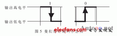 系統(tǒng)的無線通信載波頻率選用433.92MHz,發(fā)射速率取9600bps,采用FSK調(diào)制方式。發(fā)射前先對數(shù)據(jù)幀進(jìn)行曼徹斯特編碼。曼徹斯特編碼(如圖5所示)就是用兩個bit之間的電平變化來表示數(shù)字信號0或1。由高電平變?yōu)榈碗娖奖硎緮?shù)字0,反之則表示數(shù)字1。通過曼徹斯特編碼可以減小發(fā)射信號的直流分量,降低誤碼率,提高通信距離。