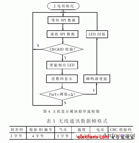 主機(jī)上電后,P89LPC930初始化,配置完MC33594后,模塊進(jìn)入等待SPI數(shù)據(jù)工作狀態(tài)。在接收到一個數(shù)據(jù)幀并經(jīng)CRC校驗(采用查表法實現(xiàn),減小MCU占用時間)和輪胎ID判斷無誤后,送數(shù)碼顯示并點亮相應(yīng)的指示燈以表示各模塊工作正常。當(dāng)輪胎監(jiān)測模塊供電電壓、氣壓及溫度接近或低于報警閾值時,主機(jī)啟動LED閃爍警告或蜂鳴器報警。程序流程圖如圖4所示。