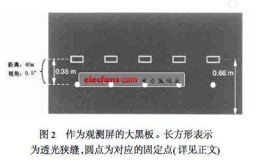 觀測(cè)屏上開(kāi)有5個(gè)狹縫,抽起任一個(gè)狹縫的擋板,觀測(cè)者便能通過(guò)狹縫看到相應(yīng)的燈。每個(gè)狹縫寬15cm,高7cm。狹縫關(guān)閉時(shí)觀測(cè)者不能看見(jiàn)狹縫,圖2所畫出的狹縫僅作說(shuō)明之用。在測(cè)試燈開(kāi)啟前,受測(cè)者通過(guò)所在車輛的近光燈的照射只能看見(jiàn)一塊有些固定白色圓點(diǎn)的大黑板。
