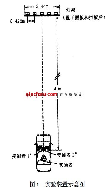 兩位受測(cè)者坐在固定的新型車座上。在受測(cè)者的正前方放置裝有5盞前照燈的支架,用一塊大黑板擋住,支架和黑板距離受測(cè)者40m。支架中心以及光源中心都與受測(cè)者車輛中心對(duì)齊,各盞燈依次平行排開(kāi),中心各距4215cm(在40m遠(yuǎn)處形成016°張角)。5盞前照燈的中心離地0166m,與美國(guó)汽車前照燈的平均安裝高度相匹配。(Schoettle,Sivak,Nakata,2002)。