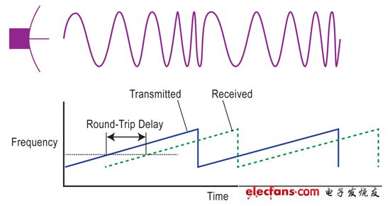 理解雷達(dá)對(duì)汽車(chē)系統(tǒng)設(shè)計(jì)的影響是從理解傳感器開(kāi)始的。大部分汽車(chē)?yán)走_(dá)設(shè)計(jì)都愿意使用24或者77-GHz自由頻段。發(fā)送器一般是頻率調(diào)制的連續(xù)波(FMCW)設(shè)計(jì),它發(fā)出“啁啾”:在頻域的快速變化,如圖2所示。