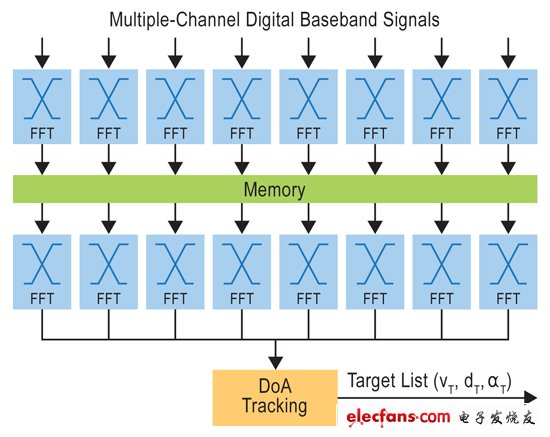 來自每一通道的數(shù)字基帶信號流入到快速傅里葉變換(FFT)模塊中,實現(xiàn)長度高達2K采樣的變換。Reuter說:“過去,執(zhí)行FFT意味著需要很多FPGA。今天,發(fā)展趨勢是集成了浮點DSP加速器的32位微控制器?!本凼到y(tǒng)可以使用兩塊FFT從信號中提取出范圍和速度數(shù)據(jù),如圖3所示。