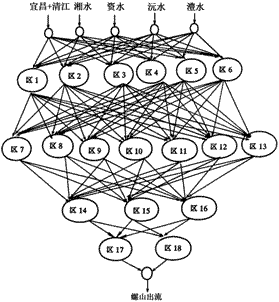 根據(jù)神經(jīng)網(wǎng)絡(luò)結(jié)構(gòu)要求,上下各個(gè)節(jié)點(diǎn)之間相互有聯(lián)系。但從物理意義上來看,河網(wǎng)上下區(qū)域并不是都有必然聯(lián)系。因此,本文將上下區(qū)域沒有必然聯(lián)系的點(diǎn)之間的權(quán)重強(qiáng)加為0,這樣使模型既滿足神經(jīng)網(wǎng)絡(luò)結(jié)構(gòu)的要求,又符合河網(wǎng)水流運(yùn)動規(guī)律。如區(qū)3除與區(qū)11有水量交換外,與第三層其余節(jié)點(diǎn)之間沒有水量交換,故在模型中可以賦0.另外為簡化起見,三口來流合并為一個(gè)來流,故荊江與洞庭湖之間的關(guān)系可以概化為與圖2相似的網(wǎng)絡(luò)模型。