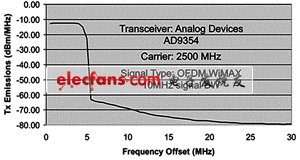 在設(shè)計(jì)過(guò)程中,發(fā)射噪聲與頻率偏移的關(guān)系圖會(huì)有幫助。法定雜散輻射限制轉(zhuǎn)換為dBm/MHz后,便可快速判斷一個(gè)收發(fā)器是否適合給定的應(yīng)用。圖2為一個(gè)多路輸入、單路輸出(MISO) WiMAX/WiBRO RF收發(fā)器在2500MHz載波頻率和10MHz信號(hào)帶寬下的關(guān)系圖。注意,頻率偏移為1MHz積分帶寬的中心頻率。因此,如果中心頻率為5.5MHz,則積分帶寬的邊緣頻率為5MHz。5MHz是10MHz帶寬目標(biāo)信號(hào)的信道邊緣。