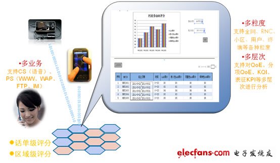 從業(yè)務(wù)上看, CS域的用戶感知,主要關(guān)注點(diǎn)為語(yǔ)音業(yè)務(wù)、vp業(yè)務(wù);PS域上的用戶感知,主要關(guān)注點(diǎn)為www業(yè)務(wù)、ftp業(yè)務(wù)、IM業(yè)務(wù)、wap業(yè)務(wù)。通過(guò)對(duì)這些業(yè)務(wù)進(jìn)行話單級(jí)的評(píng)分與失分分配,再匯聚成區(qū)域級(jí)的業(yè)務(wù)評(píng)分與失分要因分配,從而達(dá)到從微觀到宏觀,從用戶到網(wǎng)絡(luò)的整體優(yōu)化。