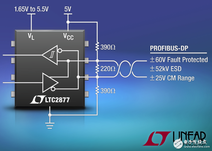 LTC2876 和 LTC2877 提供了多種保護(hù)等級,因而使其成為諸多 PROFIBUS-DP 應(yīng)用的合適之選,包括離散制造和工藝自動化。±25V 的擴(kuò)展輸入共模范圍和全面的故障安全操作改善了電噪聲環(huán)境中和存在接地環(huán)路電壓情況下的數(shù)據(jù)通信可靠性,否則會導(dǎo)致數(shù)據(jù)誤差并有可能損壞器件。該器件非常高的 ESD 保護(hù)等級可保證 LTC2876 和 LTC2877 能夠在收發(fā)器引腳上承受 ±52kV HBM,并不會發(fā)生閉鎖或受損;在所有其他引腳上均提供了至 ±15kV HBM 的 ESD 保護(hù)等級。完全對稱的接收器門限可確保這些器件維持良好的占空比對稱性 (在低信號電平條件下) 和提升接收器抗噪聲能力,同時支持全面的故障安全操作。這兩款器件皆利用 PROFIBUS IEC 61158-2 和 TIA/EIA-485-A (RS485) 負(fù)載進(jìn)行了測試,以確保與這兩項標(biāo)準(zhǔn)的兼容性。