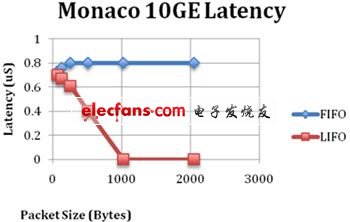 Monaco參考平臺例子包含有一個交換芯片,在1U外形尺寸內(nèi)提供24個SFP+端口。這個平臺中的時延包含了通過交換機的時延和通過SFP+ PHY的時延。這張圖顯示了交換機工作在直通模式時使用FIFO和LIFO方法的時延測量結(jié)果。