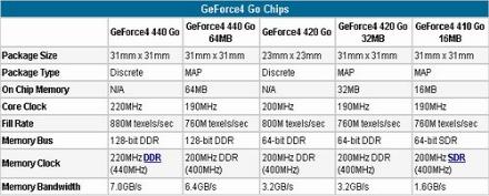 ?nVIDIA推出的GeForce4 4xx Go系列移動(dòng)顯卡,其中包括Geforce 4 460 Go、 Geforce 4 440 Go、Geforce 4 420 Go和Geoforce 4 410 Go等幾個(gè)系列的產(chǎn)品,代號(hào)NV17。這些產(chǎn)品都是由桌面版GeForce4 MX核心改進(jìn)而來的,所以它們都擁有Accuview AA引擎、T&L 引擎、和對(duì)nView的支持。不過由于進(jìn)行了簡(jiǎn)化核心,所以除了GeForce4 460其它顯卡都不具備nfiniteFX 引擎,無法支持DirectX 8,這使得它們與Mobility Radeon 7500處于同一起跑線上,因?yàn)镸7同樣最高支持到DirectX 7。