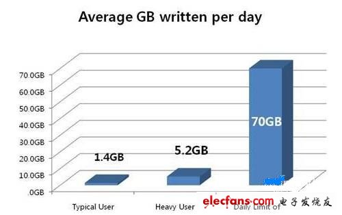 從上圖可以看出,普通辦公者(Typical user)每天的平均寫入數(shù)據(jù)約為1.4GB,而程序員之類(Heavy user)的用戶每天平均寫入數(shù)據(jù)量高達(dá)5.2GB。