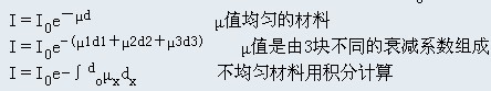 對(duì)于能量為E的單能射線,當(dāng)其通過厚度為d的材料后,其X線強(qiáng)度由I0衰減為I,可以用公式表示: