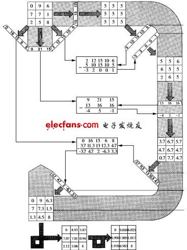 設(shè)一個(gè)斷層由9個(gè)像素組成,中間像素密度值為1,其余各像素均為0。從A、B、C 、D 4個(gè)方向分別記錄斷層的密度分布,得到a、b、c、d 4條投影曲線。如果直接用上述4 條投影曲線作反向投影,即A′、B′、C′、D′這4個(gè)投影矩陣分布迭加,得到矩陣M′,其中央密度是4,4周有8個(gè)1。這8個(gè)1就是云暈狀陰影。