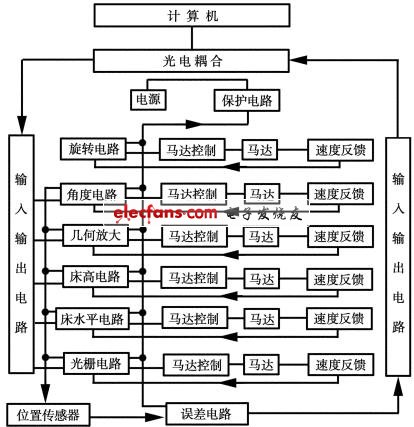 掃描架的運(yùn)動(dòng),包括機(jī)架的旋轉(zhuǎn),傾斜角度,幾何放大,控制光柵開口的大小,掃描床上、下、前、后運(yùn)動(dòng)。這些運(yùn)動(dòng)首先由計(jì)算機(jī)發(fā)出運(yùn)動(dòng)指令,由控制電路控制電機(jī)的運(yùn)轉(zhuǎn),通過減速機(jī)構(gòu),完成上述各種運(yùn)動(dòng)。為了使運(yùn)動(dòng)速度穩(wěn)定,電機(jī)軸裝有測(cè)速發(fā)電機(jī),輸出信號(hào)反饋至控制電路。