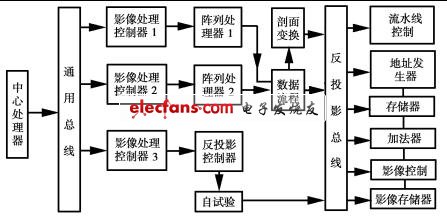 陣列處理器是高速算術(shù)運(yùn)算器。反投影處理器的主要功能就是在反向涂抹原始掃描數(shù)據(jù)進(jìn)入影像處理器時(shí),對(duì)應(yīng)某一個(gè)掃描物體斷層中的像素Px,找出哪些數(shù)據(jù)應(yīng)該影響該像素及其加權(quán)系數(shù),加權(quán)系數(shù)取決于距離旋轉(zhuǎn)中心的距離。反投影控制器用來完成對(duì)反投影的控制作用。它是專用微處理器,并具有專門的硬件,如快速總線、接口控制、存儲(chǔ)器和地址發(fā)生器。