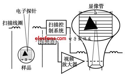 二次電子探測器輸出的電信號由視頻放大電路放大后被加在柵極上,包含樣品表面信息的電信號能使柵極電位發(fā)生變化,進一步通過柵極控制了電子束轟擊熒光屏?xí)r在某一瞬間的能量的大小,同時在顯像管偏轉(zhuǎn)線圈的掃描作用下,能量不同的電子粒流便有序地被分布在整個熒光屏面上了.