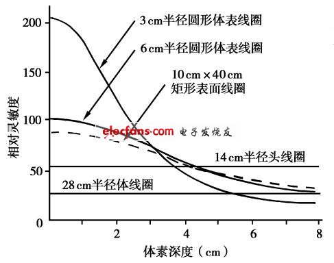 圖5-38繪出了表面線圈軸線上的靈敏度曲線和鞍形頭部及體部線圈的靈敏度曲線.頭線圈和體線圈的靈敏度的變化比較平緩,在遠(yuǎn)離體表的深度上比表面線圈的靈敏度高。