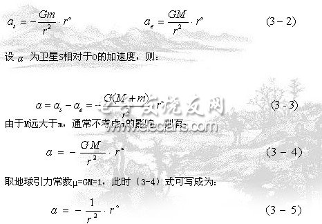 在圖3-1中所示的二體問題中,依據(jù)萬有引力定律可知,地球O作用于衛(wèi)星S上的引力F為: