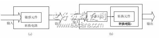 簡單直接式變換的結(jié)構(gòu)形式如圖1.1所示。圖1.1(a)是最簡單的信號變換,敏感元件的輸出一般應(yīng)是電學(xué)量,轉(zhuǎn)換電路的作用是電信號的放大或電信號間的轉(zhuǎn)換。圖1.1(b)中的敏感元件的輸出一般是非電的中間物理量。轉(zhuǎn)換元件將該物理量轉(zhuǎn)換成電學(xué)量。