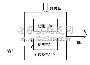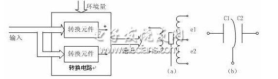 如圖1.4所示,參比式變換中采用兩個性能完全相同的檢測元件,它們同時感受環(huán)境條件量,但只有一個感受被測量。轉(zhuǎn)換電路的作用是將同時作用在二個檢測元件上的環(huán)境條件量的干擾信息除去,對被測量信息進行放大。