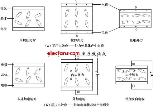 壓電效應泛指晶體處于彈性介質中所具有的一種聲-電可逆特性,此現(xiàn)象為法國物理學者居里兄弟于1880年所發(fā)現(xiàn),故也稱居里效應(圖7-4)。