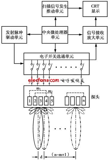 由n個振子(或稱振元)組成線陣換能器,各振子中心間距為d。每次發(fā)射和接收,由相鄰m個振子構(gòu)成一個組合,并借助電子開關(guān)順序改變這種組合。比如,第1次由組合m1(假定由振子1~4組合)進行發(fā)射和接收,此時發(fā)射聲束中心位于振子2、3中間,并與探頭垂直;第2次發(fā)射由組合m2(由振子2-5組成)進行,此時發(fā)射聲束中心位于振子3、4之間。兩次發(fā)收波束空間位移為d,按順序經(jīng)過(n-m+1)次發(fā)射和接收,即可完成聲束橫向掃描范圍為(n-m+1)d的一幀完整影像的探查。