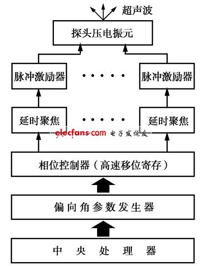這64個不同周期的序列脈沖分別代表64個偏向角的序列信號。它們分時順序加入相位控制器。相位控制器用來把偏向角參數(shù)轉(zhuǎn)換成相控陣的觸發(fā)信號。每當偏向角參數(shù)發(fā)生器送入1個代表某一偏向角度的脈沖,相位控制器就產(chǎn)生1次發(fā)射所需的若干個等值時差為τ1的觸發(fā)信號,觸發(fā)信號的個數(shù)由探頭振元數(shù)確定,可以是32個或者是48個。這在技術(shù)上可以采用一個32位或者48位輸出的移位計數(shù)器,并通過選定移位寄存器的工作速度來保證在下一個偏向角時序脈沖到達之前,移位寄存器工作完畢。得到的32路(假設(shè)探頭振元數(shù)為32)觸發(fā)信號,分別送往32路發(fā)射聚焦延遲電路,各路延遲量由設(shè)定焦距而定。經(jīng)聚焦延遲的32路觸發(fā)信號再分送于32路脈沖激勵器,所產(chǎn)生的32個激勵脈沖分別加于探頭中的32個壓電振元,激勵各振元產(chǎn)生超聲波發(fā)射。