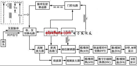 主控制單元是以中央微處理器、超聲頻率振蕩發(fā)生器為核心的中樞機構(gòu),它可以改變振蕩器發(fā)生的頻率f,控制發(fā)射單元中脈沖形成的周期(或脈沖重復頻率FPR),協(xié)調(diào)探頭的收、發(fā)工作狀態(tài)以及啟、閉接收電路中的距離選通門。振蕩器產(chǎn)生的超聲波頻率信號分為兩路:一路送至發(fā)射電路中的門控電路,供其調(diào)制成脈沖信號送出;另一路傳至接收電路中作為原始信號的相位參考標準。