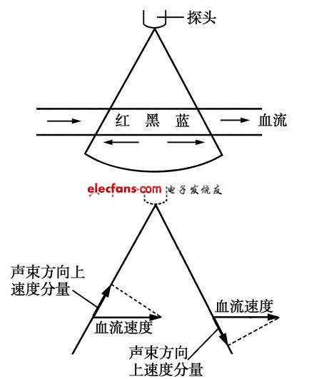 另外,由于超聲B型成像顯示的配合使用,脈沖式多普勒診斷儀還可以在B型影像上顯示出多普勒聲束線和目標運動方向上的夾角θ,于是根據(jù)v→=Δf·c/(2f·cosθ)便可得出目標的運動速度。