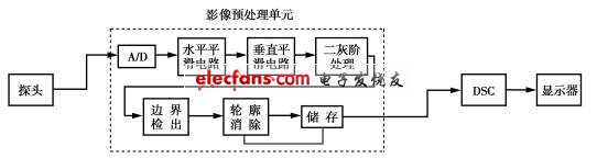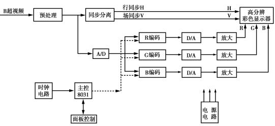 預處理電路主要對外來的B超視頻信號進行幅度的調整以適應不同B超儀的配接需求。A/D變換后,對輸入像素的灰階進行綠、紅、藍3個獨立的變換,然后經過程序庫查尋,與同步信號進行復合,把3個結果單獨地加到彩色顯示器的紅、綠、藍3個電子槍上,就完成了一幅受變換函數性質所調制的彩色合成影像。