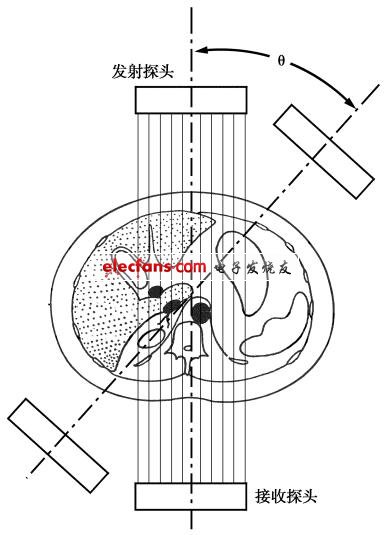 1對共軸的發(fā)射換能器和接收換能器同步地沿著1條直線掃描,取得切面內的投影數據,然后這對發(fā)射接收換能器組在同一平面中旋轉1個角度,再作直線掃描,取得這個視角的投影數據,如此繼續(xù)下去,取得足夠多的數據后,再把這些信息組合起來,象X-CT那樣,使用代數重建法或反投影技術來重建影像。