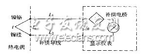 ③自動補償法 用對溫度敏感的銅電阻作為電橋的一個橋臂,利用不平衡電橋的輸出電壓補償熱電偶自由端的電勢。帶補償電橋的熱電偶測溫系統(tǒng)如圖2.1。圖中的補償導線是用來延伸熱電偶自由端從