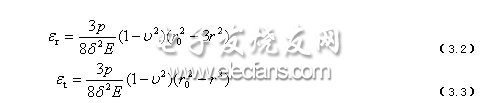 應變式壓力傳感器是由彈性元件、應變片以及相應的測量電路組成。圖3.3是一種典型的粘貼式的應變片分布結構及應力曲線圖。在被測壓力作用下膜片變形向上凸起,膜片上任一點的徑向應變和切向應變