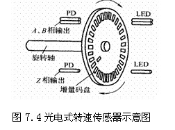 轉速表主要用于測量旋轉體在單位時間內的轉速。按工作原理分有將轉速變換為角位移量的離心式、磁性式測速儀;有利用人眼視覺暫留現(xiàn)象的頻閃式測速儀;有將轉速變換成電壓的測速電機;還有將轉速變換為脈沖頻率的脈沖式轉速表等。圖7.4給出了一個光電式脈沖轉速傳感器示意圖。增量碼盤隨旋轉軸轉動,光敏元件輸出一個個脈沖信號代表轉軸的轉速。采用三組光源(A,B和Z)-光敏元件可以同時實現(xiàn)轉角和轉向的測量。