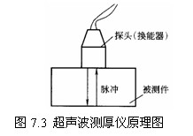 超聲波測厚儀:超聲波從發(fā)射到接收從被測件底面反射波所需要的時間與厚度有關,測量原理如圖7.3所示。超聲波測厚儀有共振法、干涉法和脈沖法等,其中前兩種方法可用于厚度在0.1mm以上、準確度要求較高的測量;脈沖法只能用在厚度在1mm以上的材料,測量準確度約為1%。
